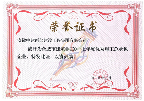 热烈祝贺中建西部被评为 合肥市建筑业2017年度优秀施工总承包企业