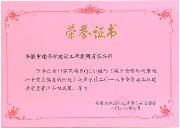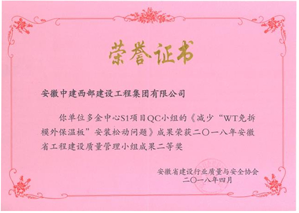 2018年4月3日至4日由安徽省建筑行业质量与安全协会主办的“安徽省2018年度建筑业QC小组活动成果发表会”顺利召开。此次活动共有360项成果参赛,其中我公司申报的《减少“WT免拆模外保温板”安装松动等问题》和《减少金刚砂耐磨地坪平整度偏差问题》两项QC成果,荣获安徽省工程建设优秀QC成果二等奖。