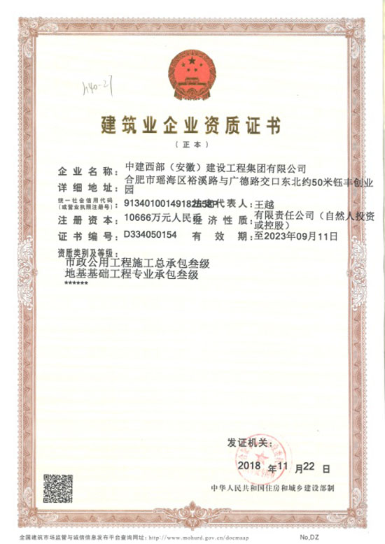 伴随中建西部经营业务稳步拓展以及整体实力的不断提升,2018年11月22日,中建西部建设再获合肥市城乡建设委员会批准,在公司原有市政公用工程施工总承包叁级资质基础上,新增地基基础工程专业承包资质,资质等级叁级。