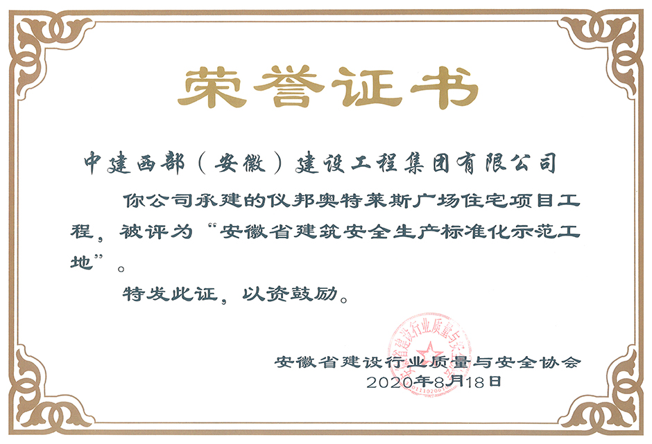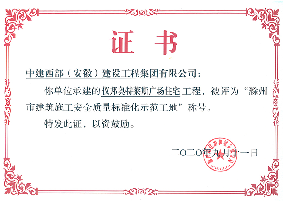 此次滁州仪邦奥特莱斯广场住宅项目能荣获建筑施工安全质量标准化示范工地荣誉,是安徽省建设行业质量与安全协会、滁州市建筑主管部门对项目安全质量管理成果的高度肯定。中建西部建设集团将一如既往地继续打造让群众满意的精品工程和口碑工程。