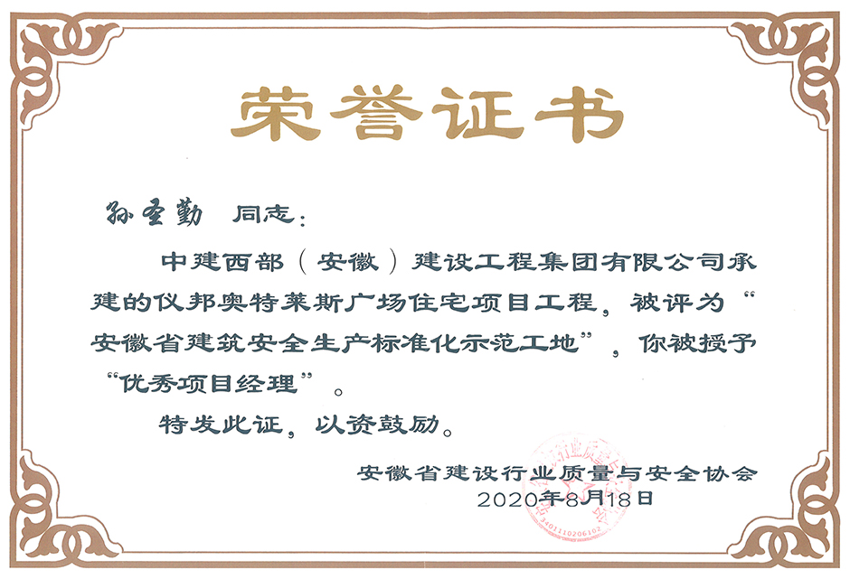 近日,喜报连连,中建西部建设集团滁州仪邦奥特莱斯广场住宅项目同时荣获安徽省建设行业质量与安全协会、滁州市住房和城乡建设局颁发的“安徽省建筑安全生产标准化示范工地”与“滁州市建筑施工安全质量标准化示范工地”称号。项目经理孙圣勤同志被授予“优秀项目经理”。