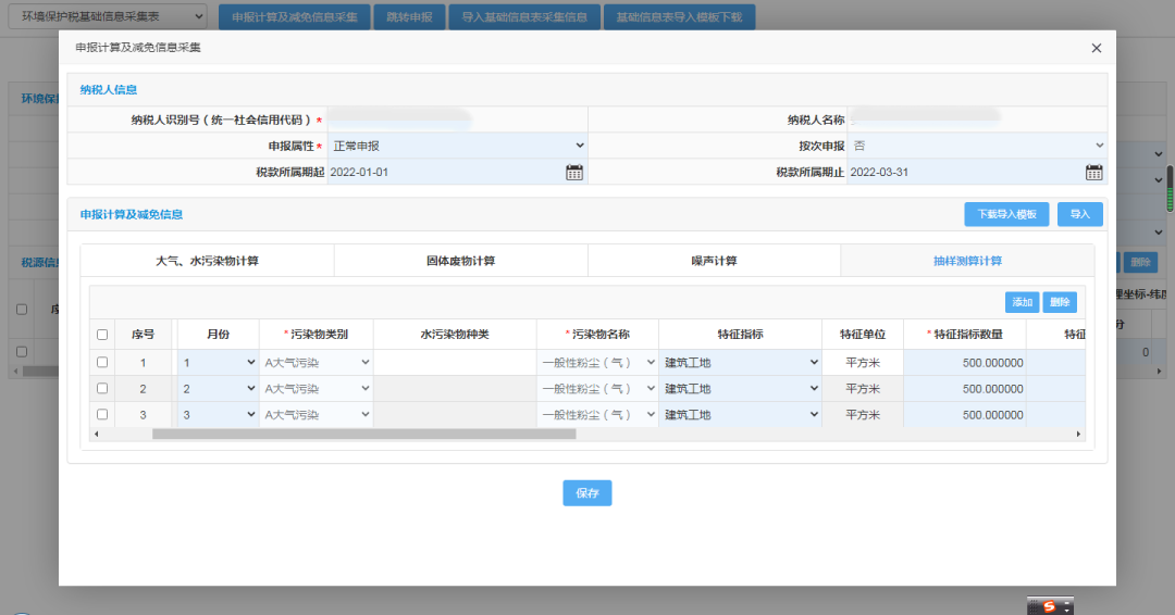 依次输入带“*”的必填项,注意排放口编号自拟,污染物名称选择“一般性粉尘(气)”,征收子目选择“建筑工地”、“市政、拆迁、道桥”,污染物排放量计算方法选择“抽样测算”,点击保存,进入申报计算及减免信息采集界面。