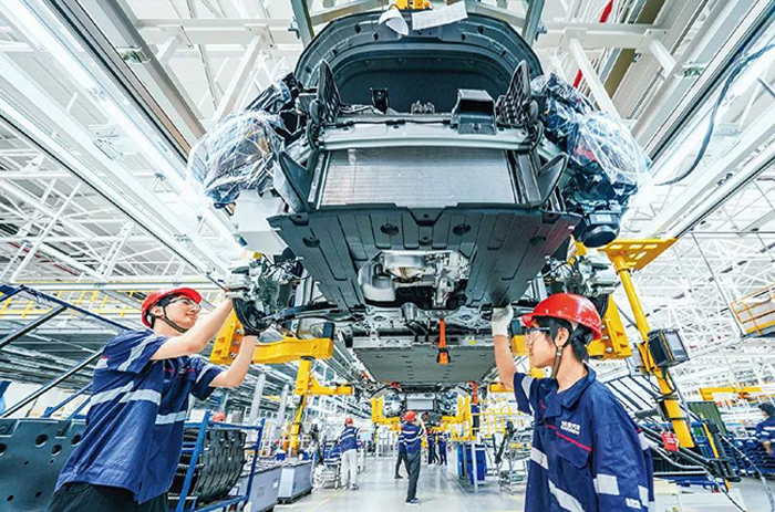 根据党中央、国务院统一部署,我国新能源汽车车辆购置税减免政策将延长至2027年底。图为2023年8月18日,位于江苏南京市溧水区的南京长安汽车新工厂,工人们正在组装全新长安新能源SUV,一辆辆新车迅速完成组装、下线,生产氛围火热。 人民图片 朱红生/摄