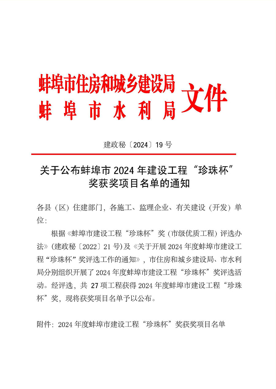 热烈祝贺中建西部(安徽)建设集团荣获蚌埠市建设工程“珍珠杯”奖
